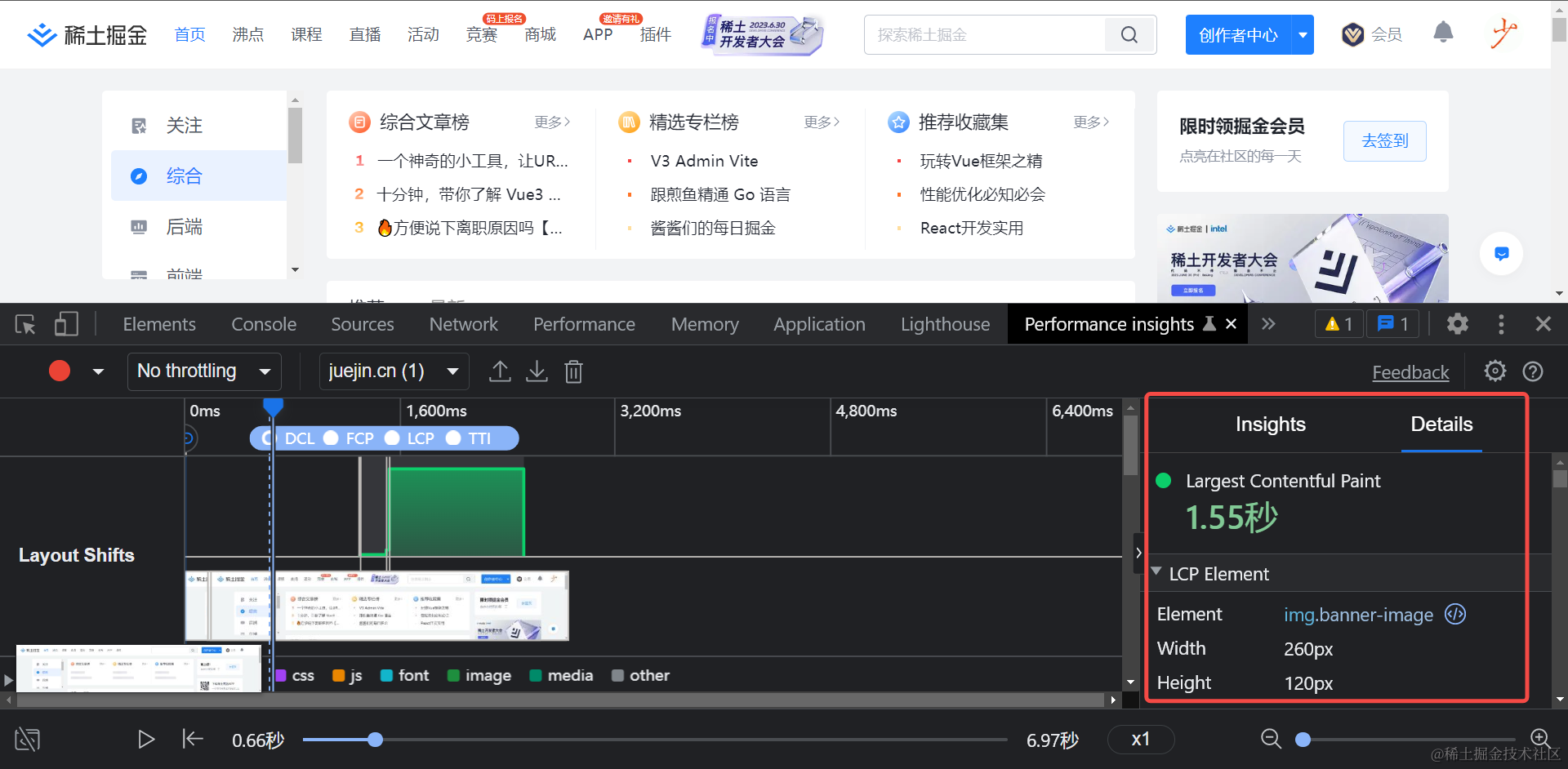 我们可以用Chrome浏览器自带 DevTool 中的 Performance Insights 工具来判断页面中什么元素是最大内容,例如下图中的img.banner-image就是掘金首页的最大内容元素,这个元素渲染的耗时为1.55秒,即LCP的值。