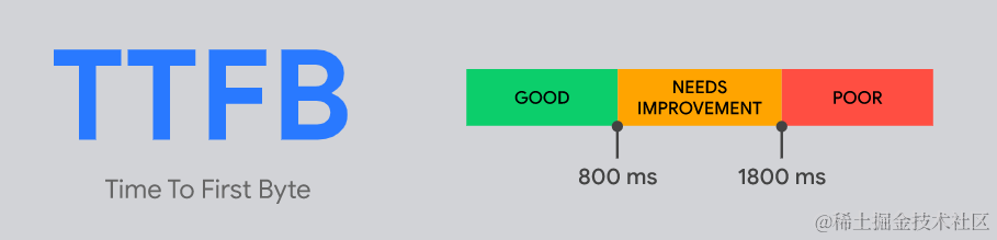 TTFB测量前端页面(Document)的HTTP请求发送后,到接收到第一字节数据响应的耗时,通常包括重定向、DNS查询、服务器响应延迟等耗时。
