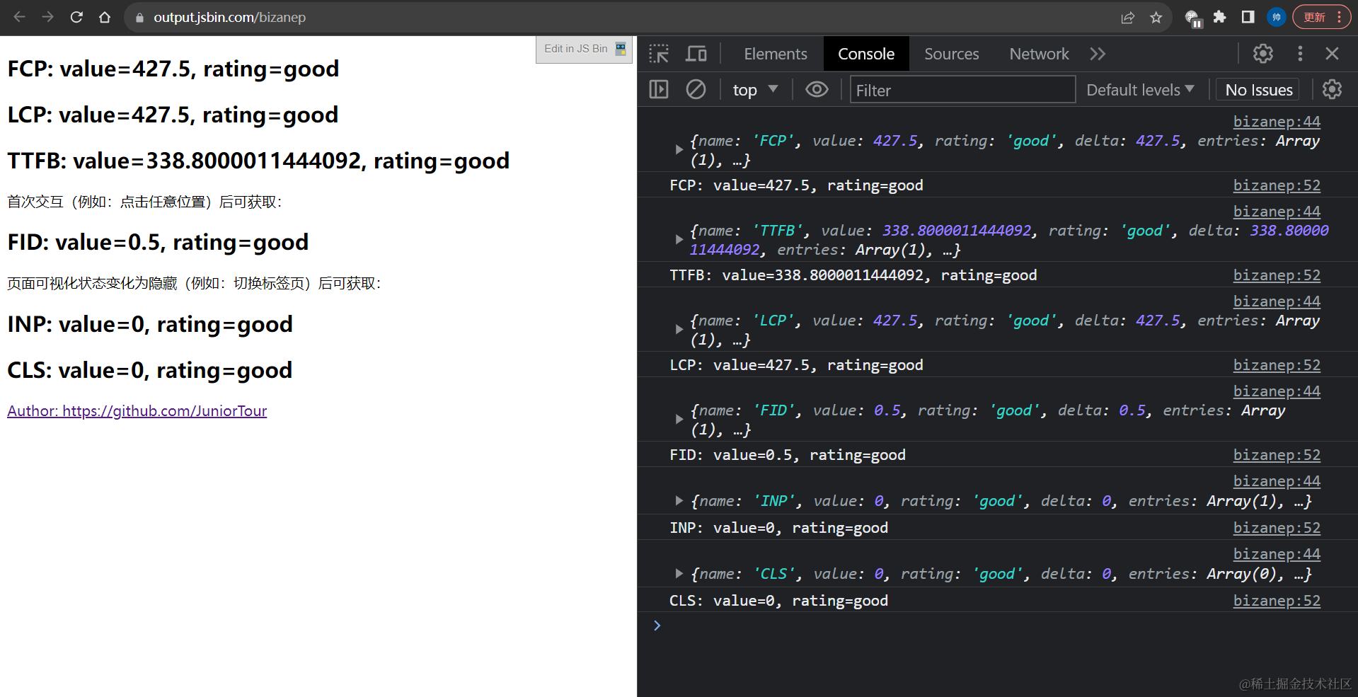web-vitals数据在线 DEMO: https://output.jsbin.com/bizanep