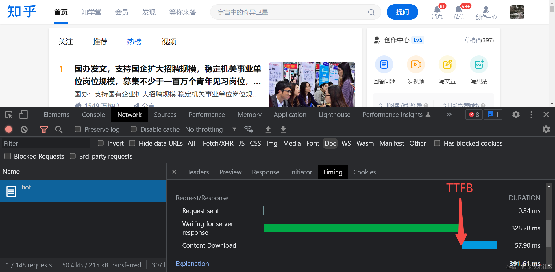 如下图的例子知乎首页的TTFB指标值即为: