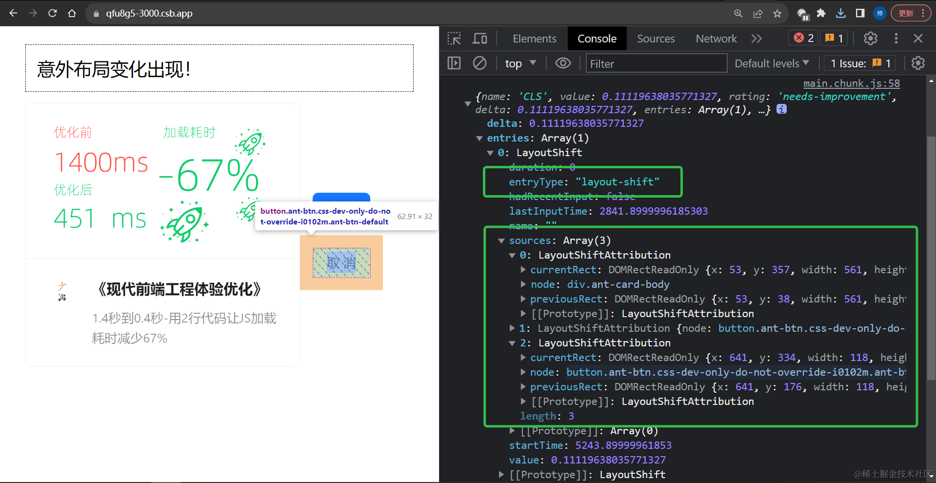 引入web-vitals库后调用onCLSAPI就能获取CLS的值,同时获取到对应的意外布局变化的具体来源,如下图中sources字段的2个对象就通过DOM元素引用,明确地告诉了我们引起布局变化的来源,以及变化前后的尺寸位置等详细数据sources[i].currentRect, sources[i].previousRect:
