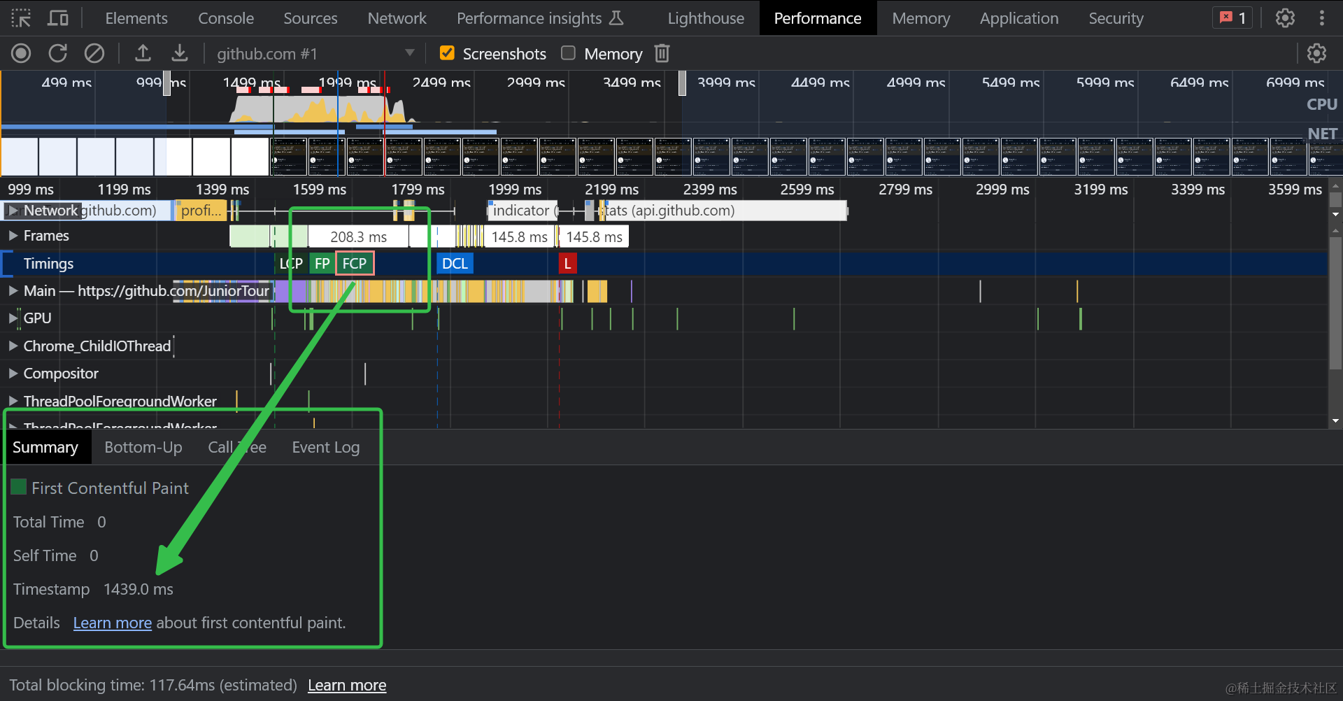 如下图中的例子,FCP指标的值为1439毫秒,在这个时刻页面中首次渲染出了文字和图像。