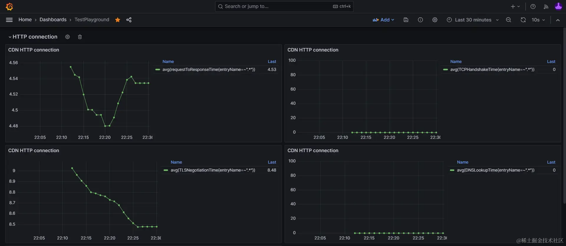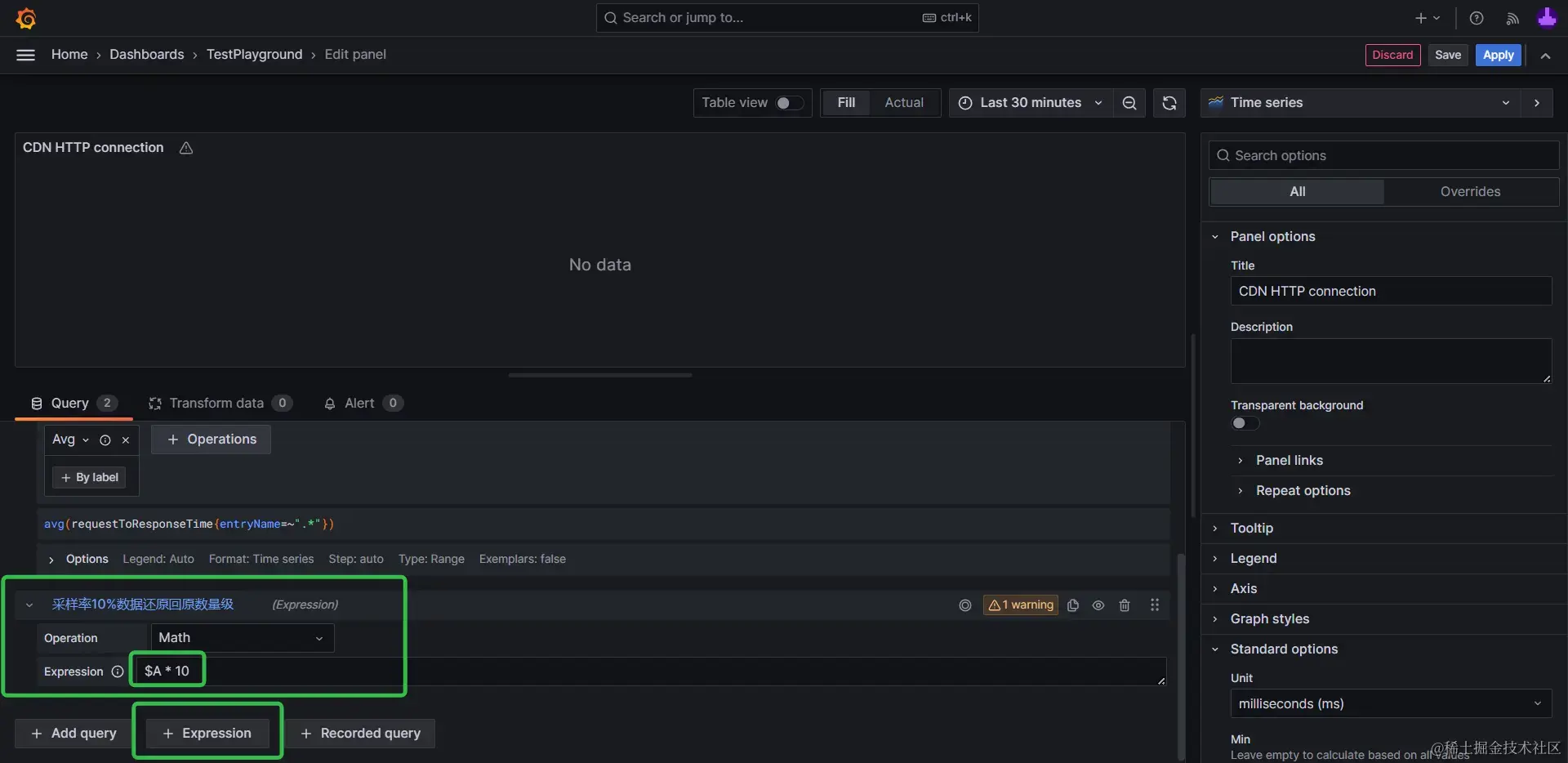 例如sampleRate = 0.1,10%采样率收集的数据,在可视化时,通过Grafana的表达式查询能力,对数据乘以10,即可将数据还原回样本总量的量级。