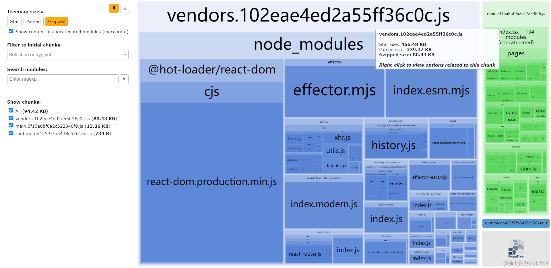 右侧是每个产物文件所包含模块的可视化图表,图表中每个方块就代表了一个模块(Module),方块的大小代表了其体积的大小,方块之间的包含关系代表模块的包含关系。