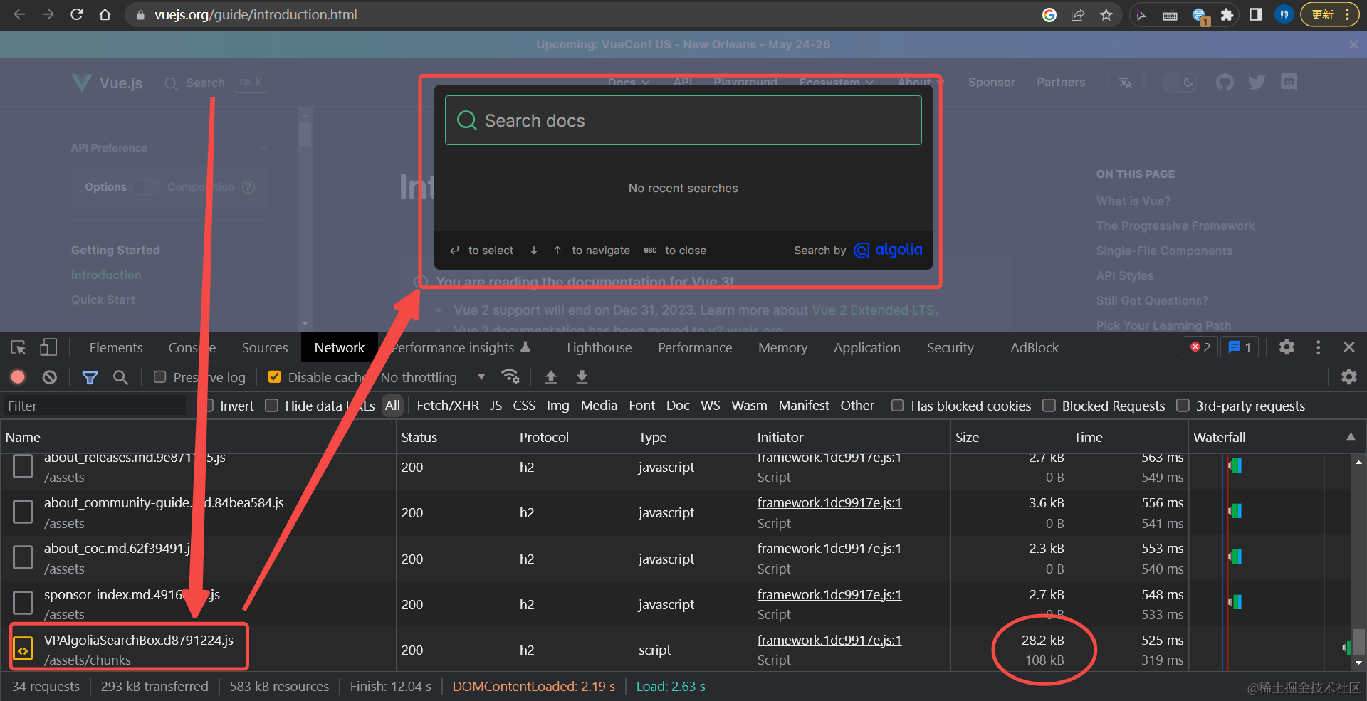 在Vue.js官方文档页面中,就对渲染搜索框组件的JS代码模块进行了懒加载优化,这部分组件的代码被分割成了一个独立的 VPAlgoliaSearchBox.d8791224.js文件,并延迟到页面渲染后、用户点击搜索框时才加载,从而为页面初始化节省了 28 KB(占总体积近10%)的JS加载体积及解析执行开销,低投入高产出地改善了用户体验。