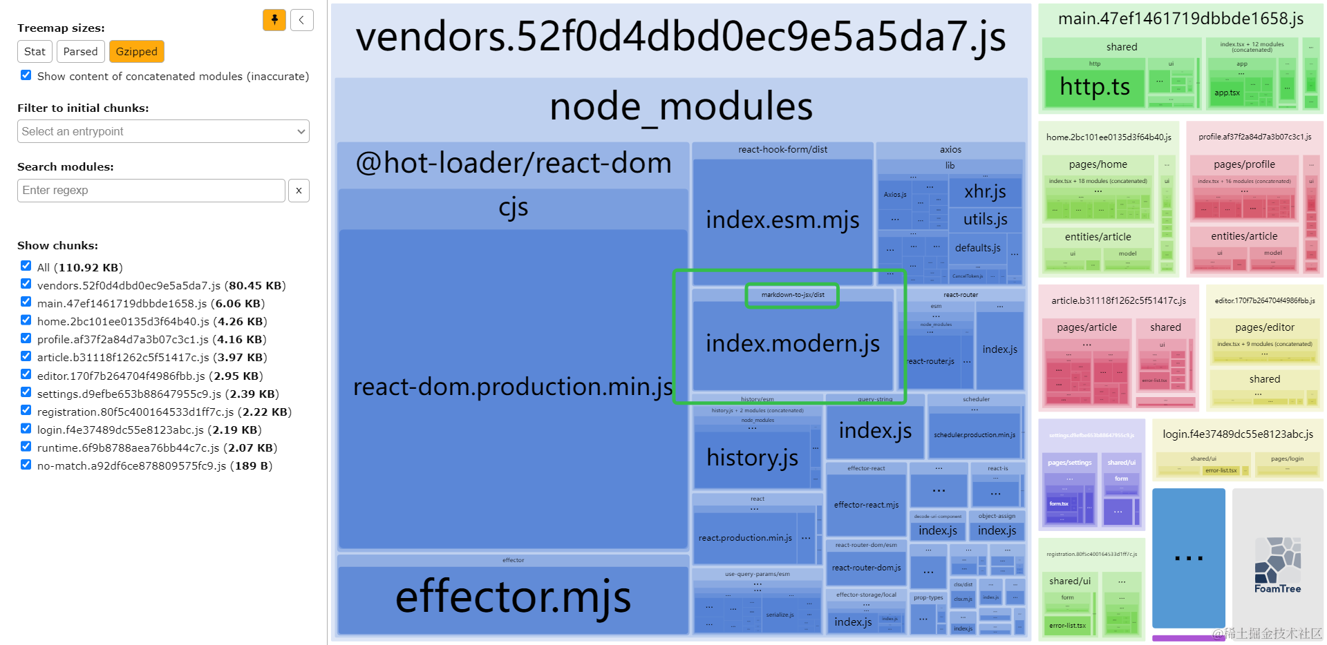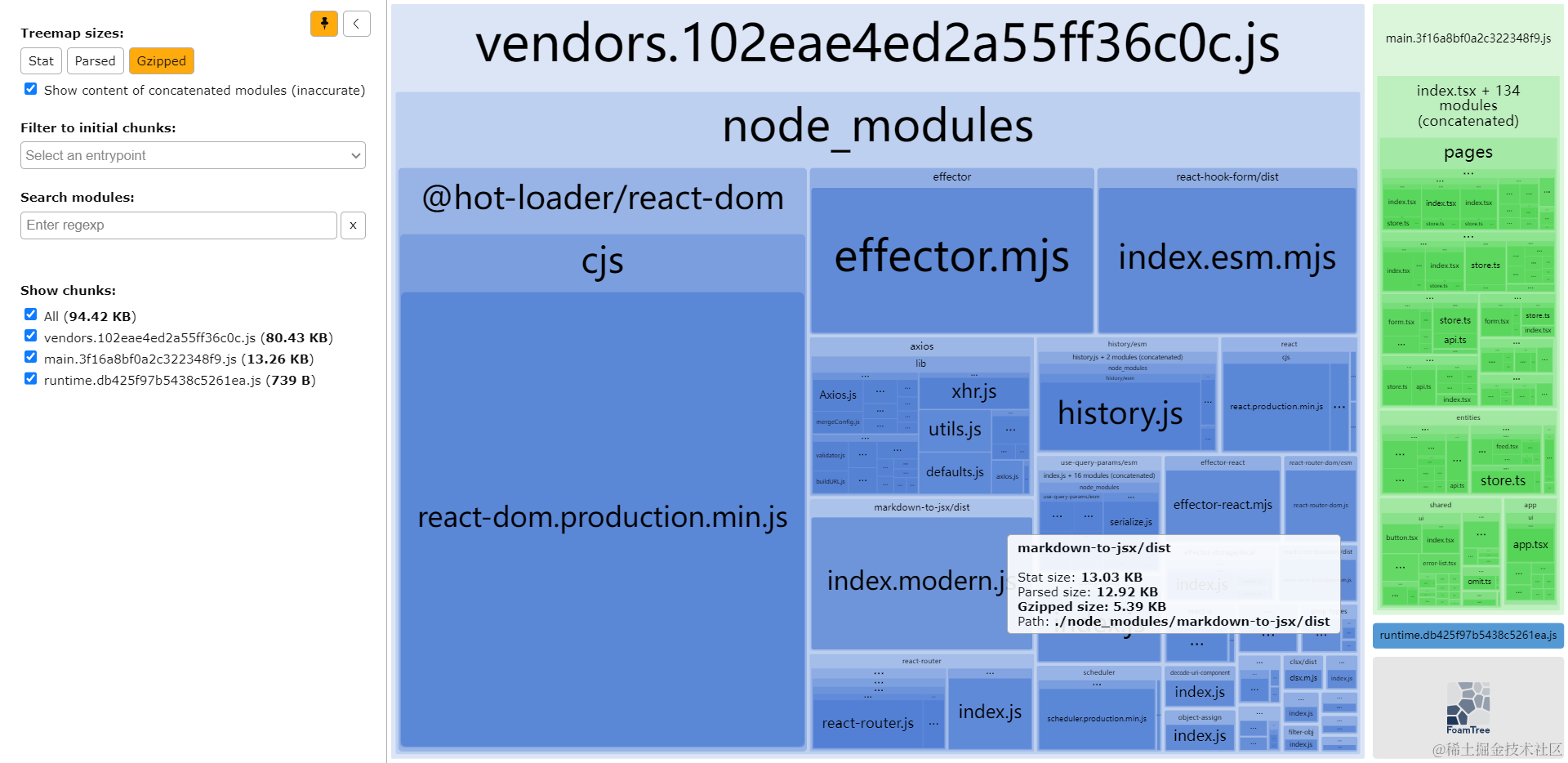 例如上图中最大的的蓝色方块就是打包产物文件vendors.102eae...js文件所包含的各个模块,其中包括: