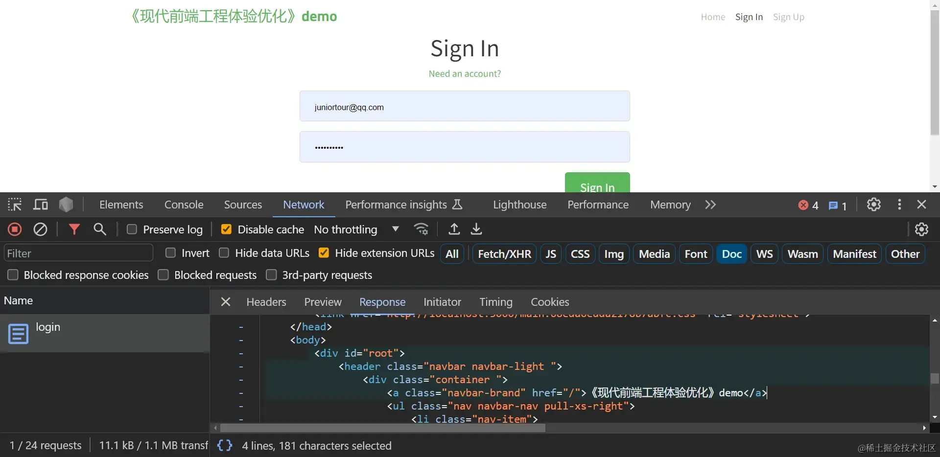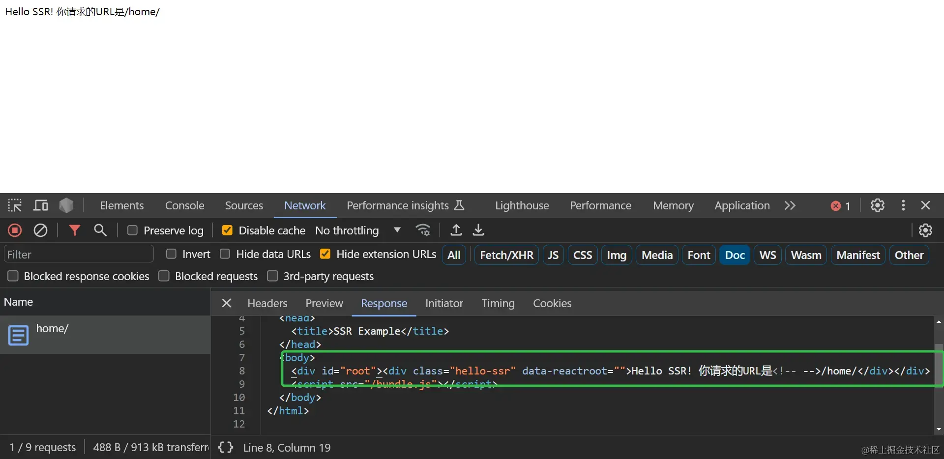 访问本地环境的URL:http://localhost:3000/home/ ,也能在Network中看到服务器直接在div#root中响应了组件源码渲染后的HTML: