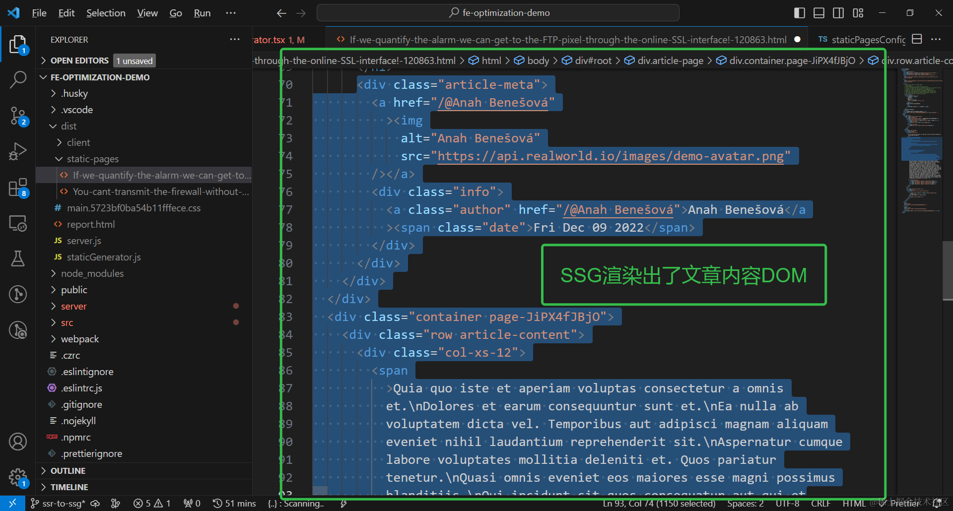 ];这样,当我们执行npm run build-run-ssg,服务端运行staticGenerator({ url, getStaticData })时,就能在renderToString执行渲染前,加载好文章页所需文章内容数据,最终渲染得到的DOM中,就会包含我们想要的文章内容DOM: