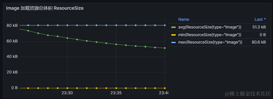 我们可以继续复用第5节中介绍的《加载资源总体积指标》,基于Performance API的transferSize或encodedBodySize属性和initiatorType获取图片类资源的体积,并在Grafana中修改查询语句为sum(ResourceSize{type="Image"}),过滤出图片类资源的体积,做出如下可视化图表: