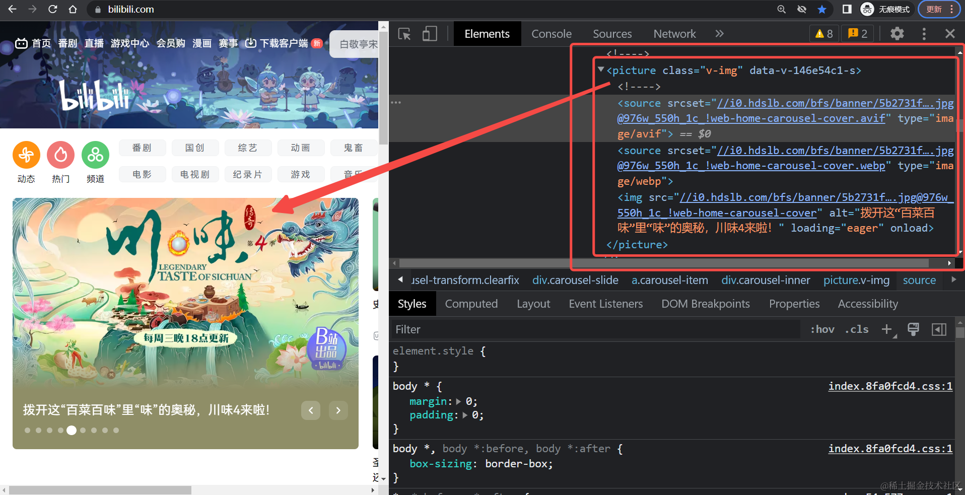 例如,Bilibili视频网站,PC版首页的轮播图、封面图都大量使用了<picture>元素: