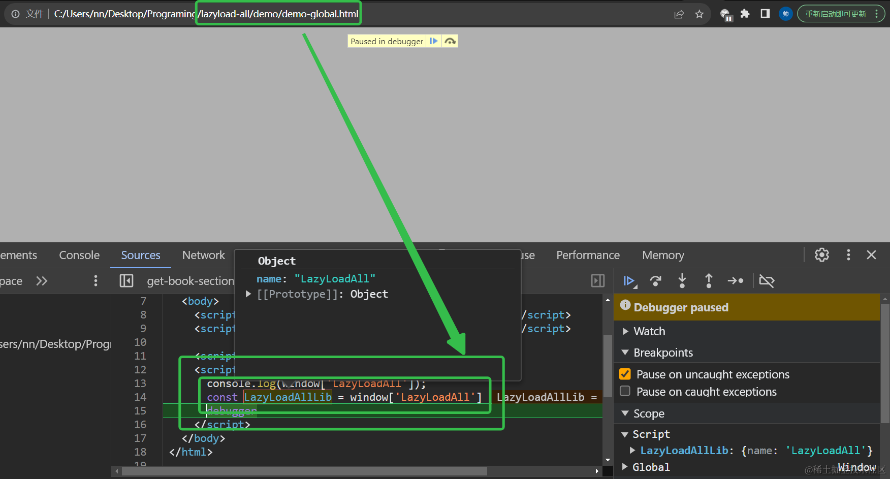 在这个HTML页面中,我们在index.js中export导出的方法、属性,就可以通过window['LazyLoadAll']方便地开发调试: