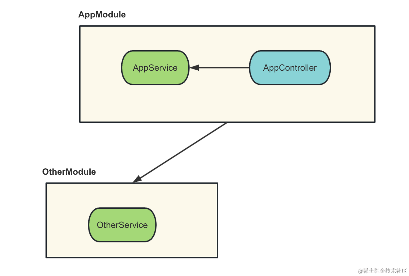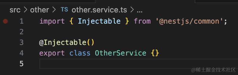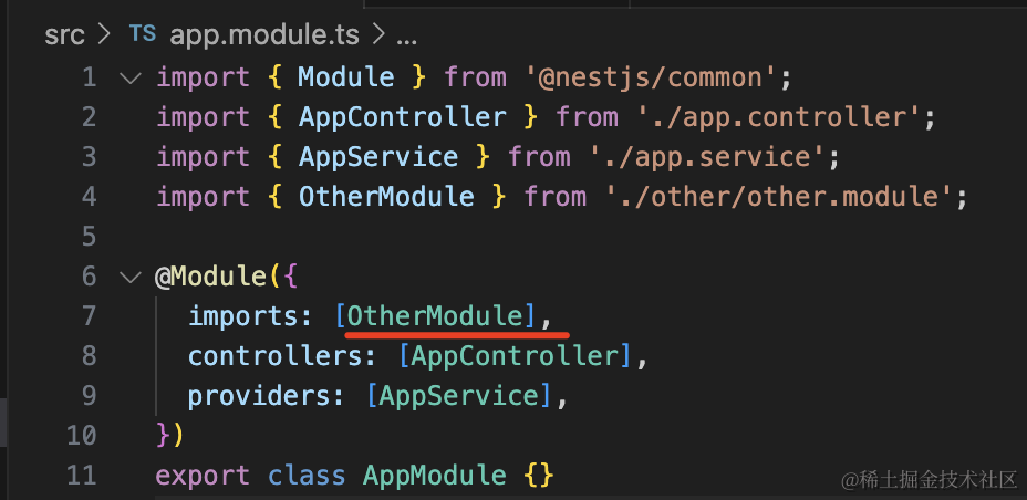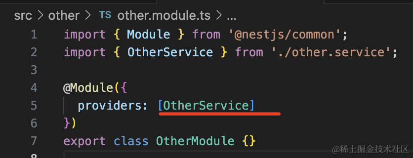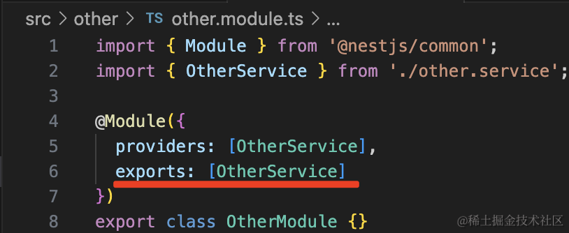 那当 AppModule 引用了 OtherModule 之后,就可以注入它 exports 的 OtherService 了。