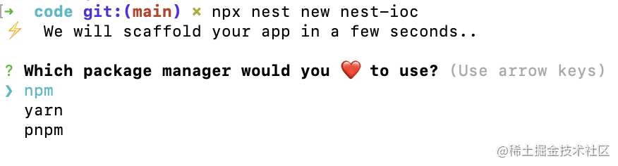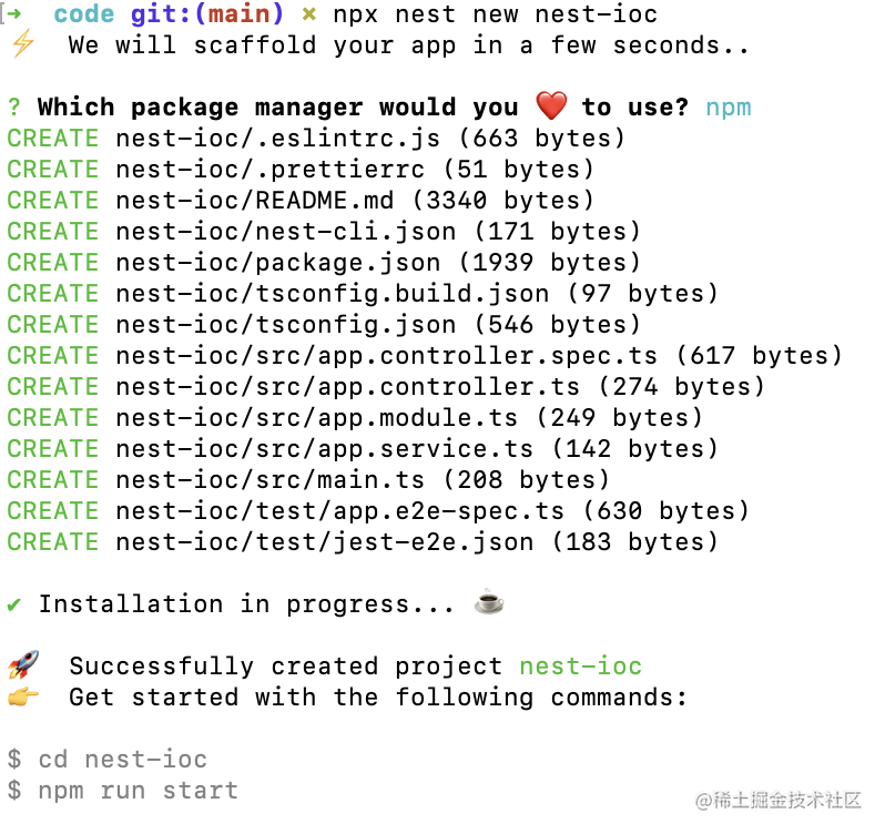 npx nest new nest-ioc执行上面的命令,它会创建一个 nest 项目: