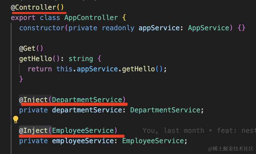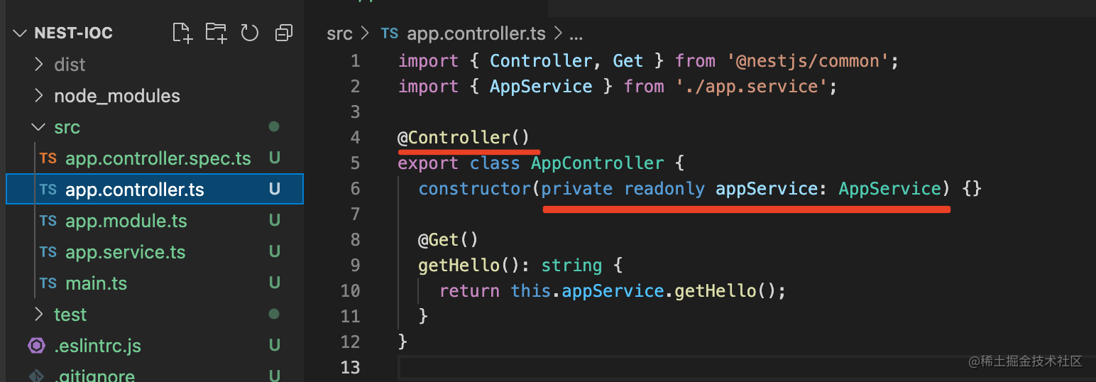AppController 声明了 @Controller,代表这个 class 可以被注入,nest 也会把它放到 IoC 容器里。