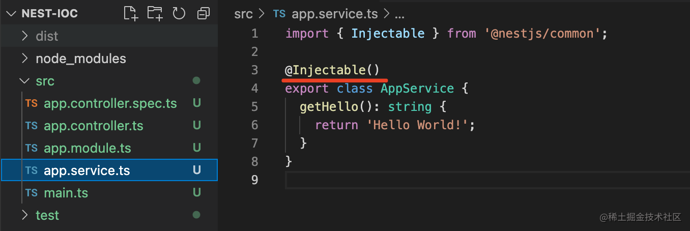 它有一个 AppService 声明了 @Injectable,代表这个 class 可注入,那么 nest 就会把它的对象放到 IOC 容器里。