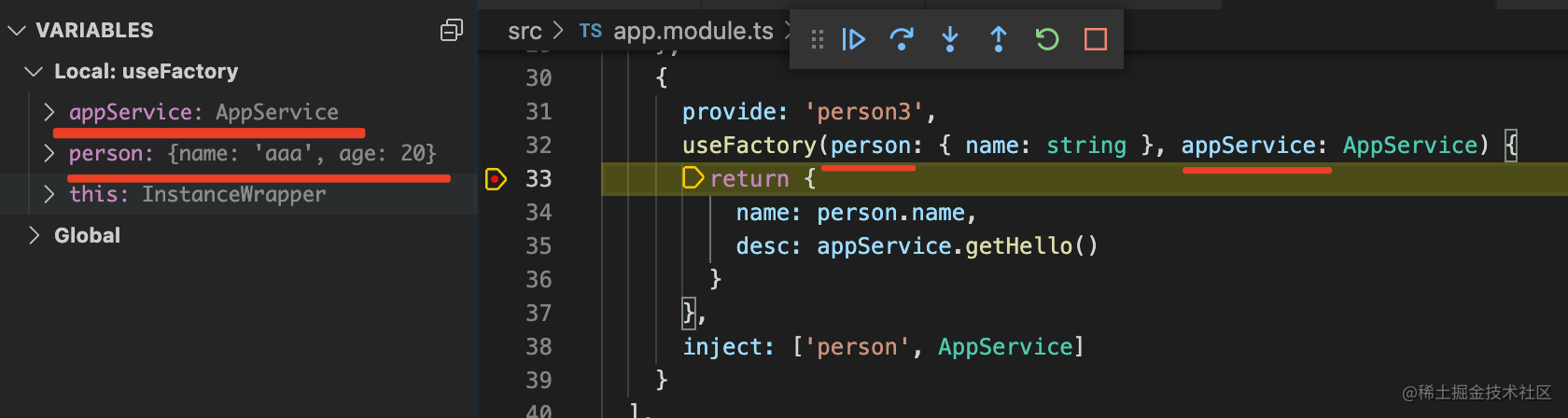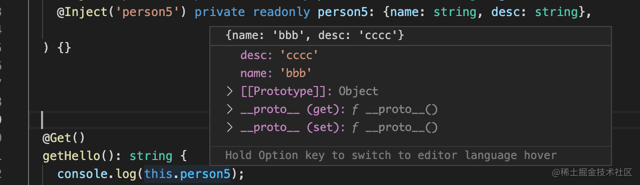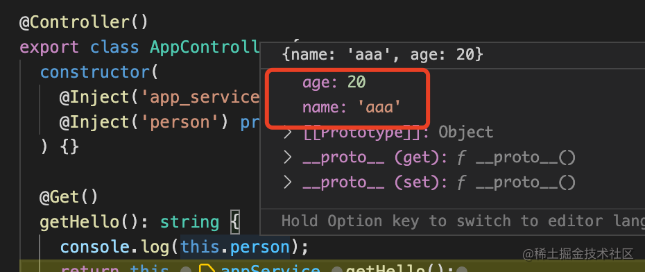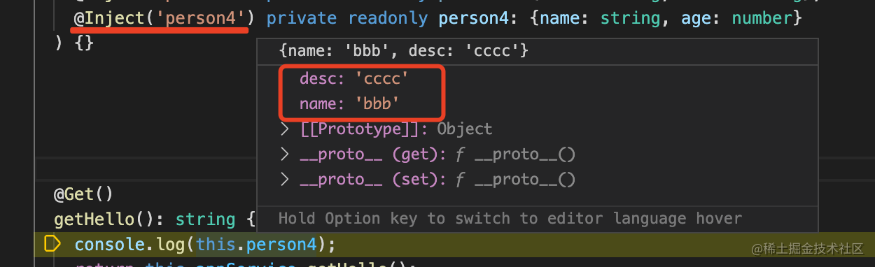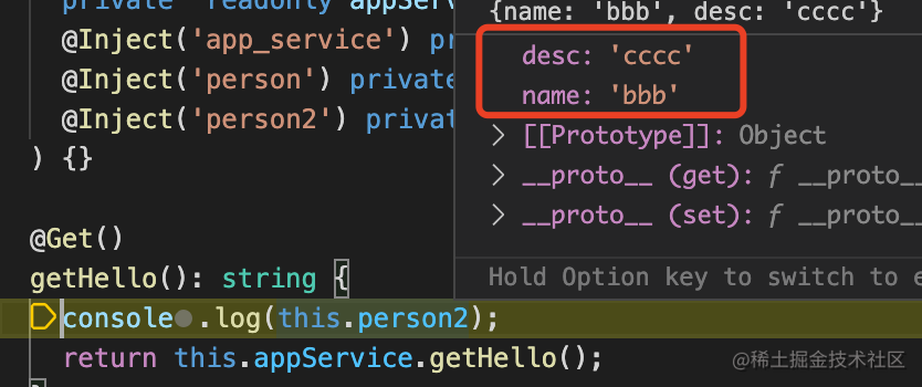 @Inject('person') private readonly person: {name: string, age: number}调试一下可以看到,确实是注入了: