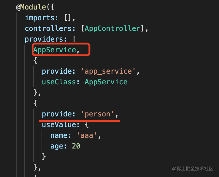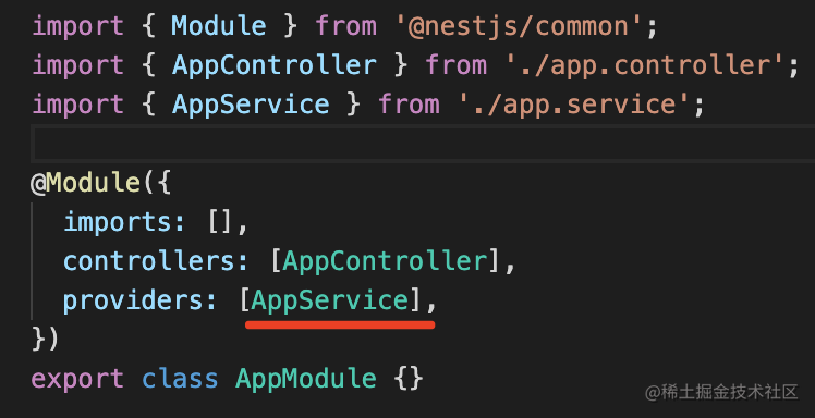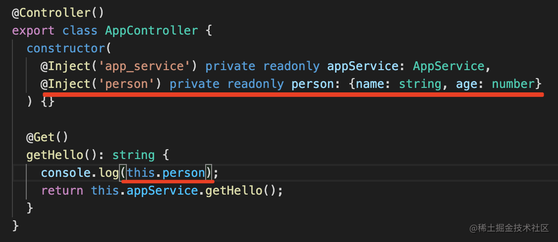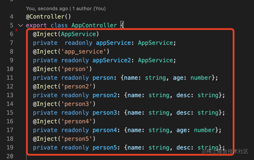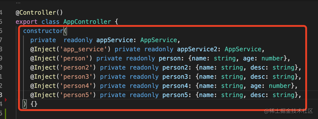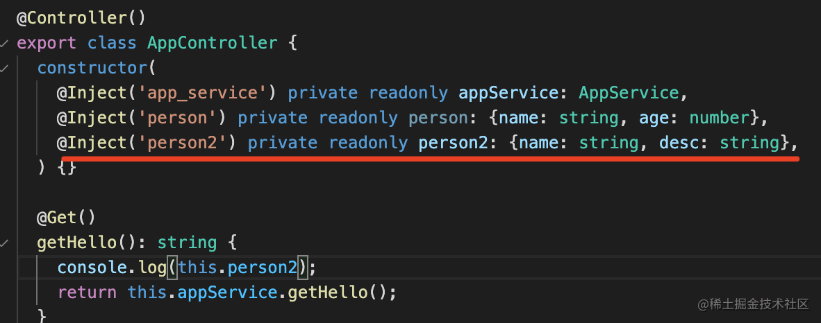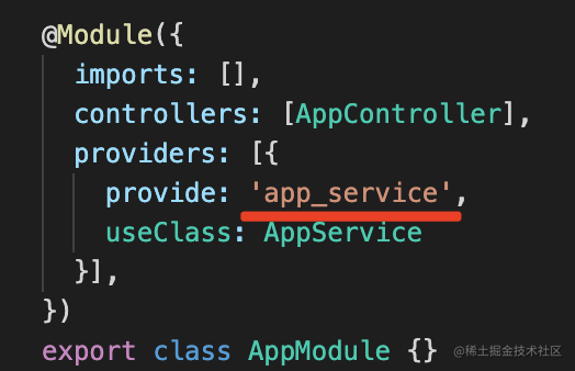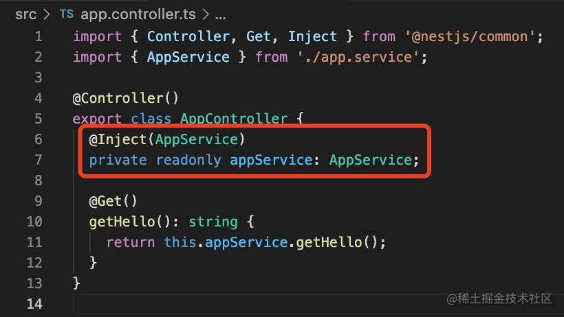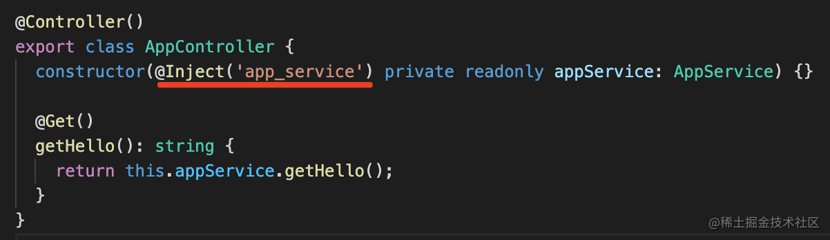 private readonly appService: AppService;通过 @Inject 指定注入的 provider 的 token 即可。