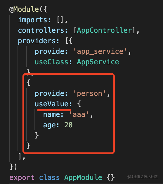 }使用 provide 指定 token,使用 useValue 指定值。