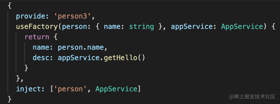 }通过 inject 声明了两个 token,一个是字符串 token 的 person,一个是 class token 的 AppService。