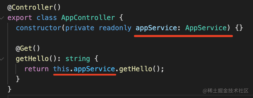 在 AppController 的构造器里参数里声明了 AppService 的依赖,就会自动注入: