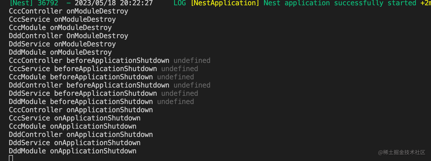 之后调用每个模块的 controller、provider 的 onApplicationShutdown 方法,然后调用 Module 的 onApplicationShutdown 方法。