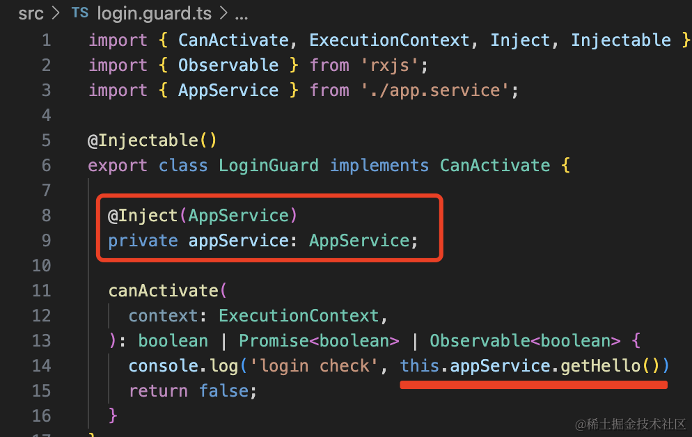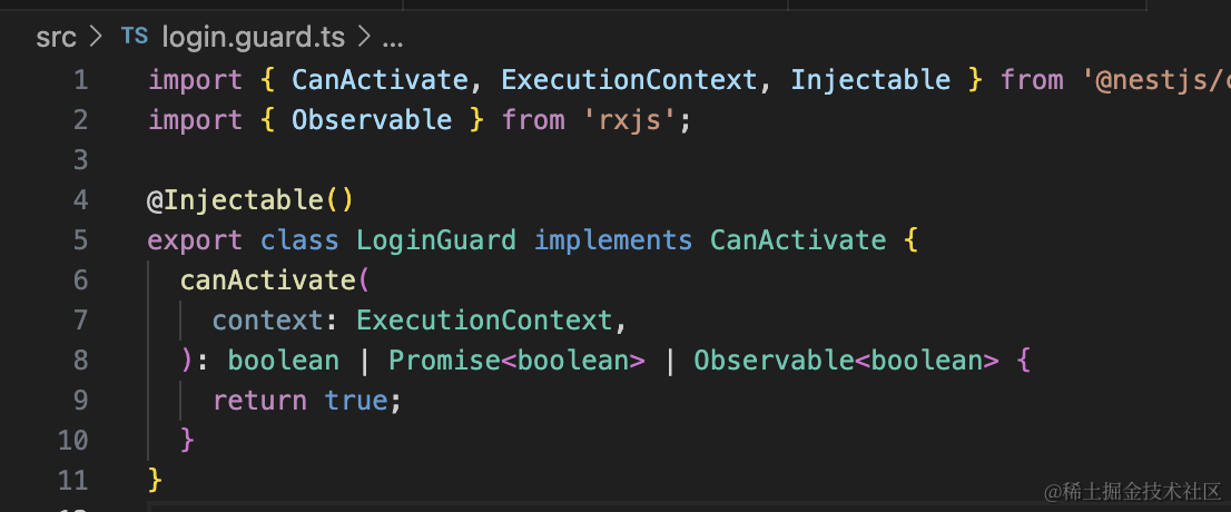 nest g guard login --no-spec --flat生成的 Guard 代码是这样的:
