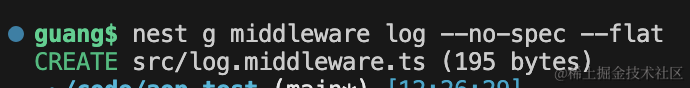 nest g middleware log --no-spec --flat–no-spec 是不生成测试文件,–flat 是平铺,不生成目录。