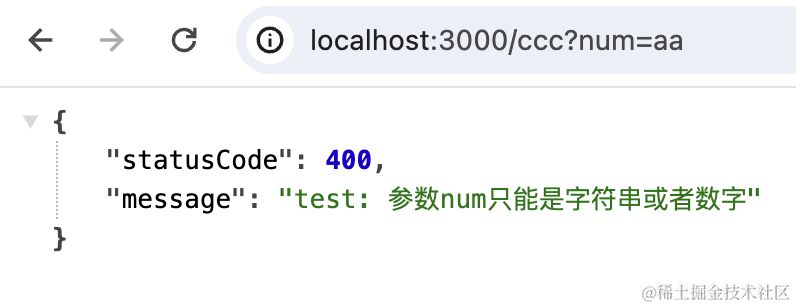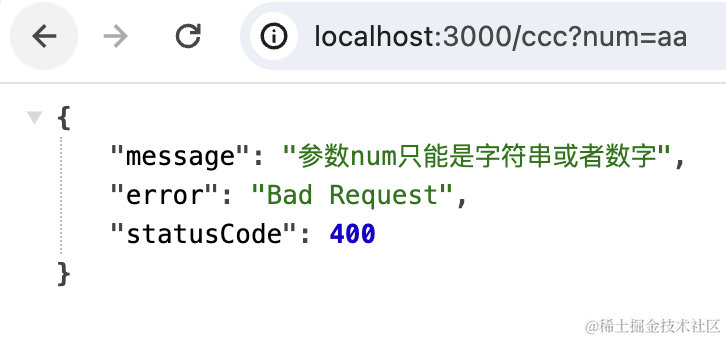 其实我们刚刚在 pipe 里抛的这个错误,能够返回 400 的响应,就是 Exception Filter 做的: