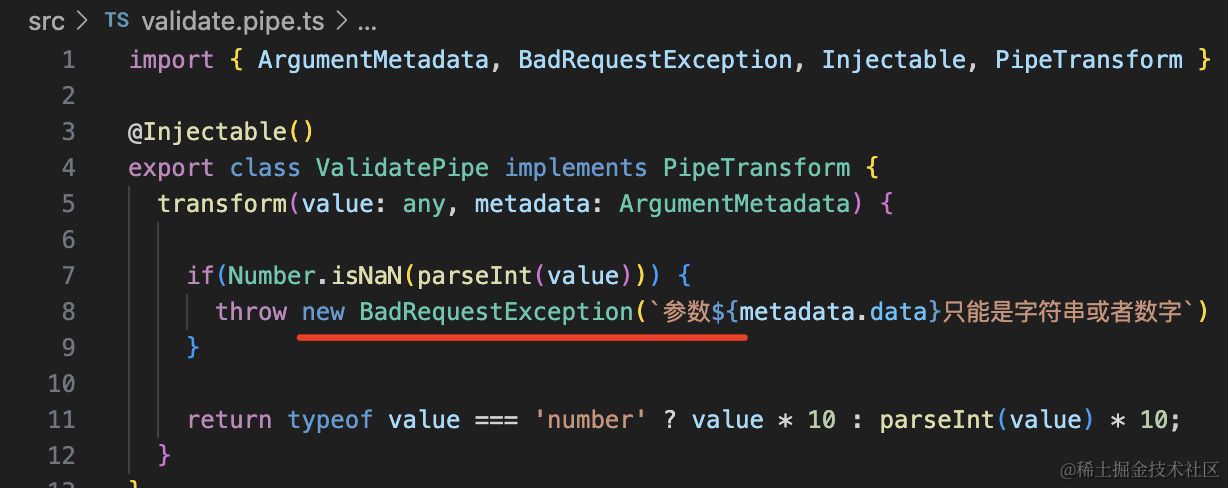 Pipe 要实现 PipeTransform 接口,实现 transform 方法,里面可以对传入的参数值 value 做参数验证,比如格式、类型是否正确,不正确就抛出异常。也可以做转换,返回转换后的值。