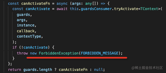 Guard 要实现 CanActivate 接口,实现 canActivate 方法,可以从 context 拿到请求的信息,然后做一些权限验证等处理之后返回 true 或者 false。