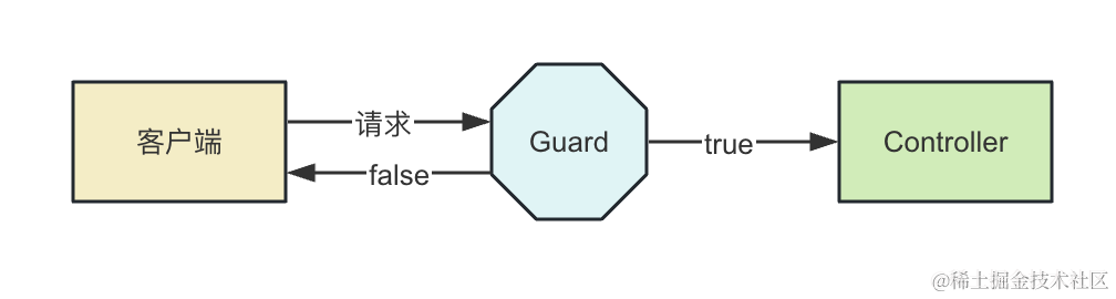 Guard 是路由守卫的意思,可以用于在调用某个 Controller 之前判断权限,返回 true 或者 false 来决定是否放行: