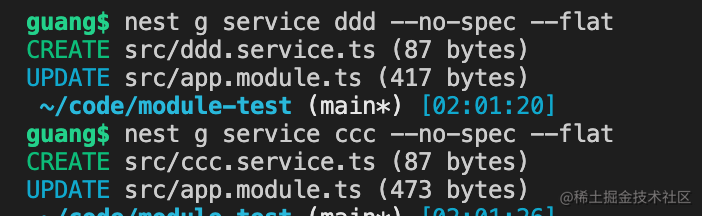 分别创建 ccc 和 ddd 两个 service,–no-spec 是不生成测试文件,–flat 是平铺。