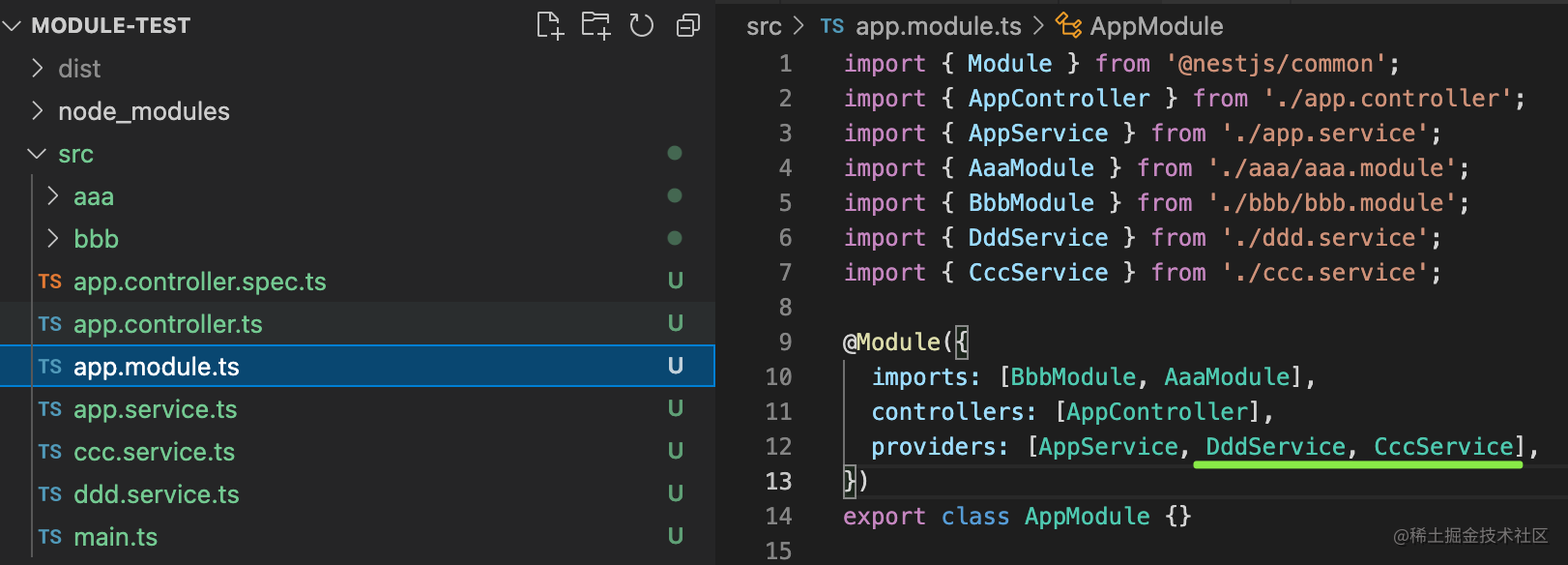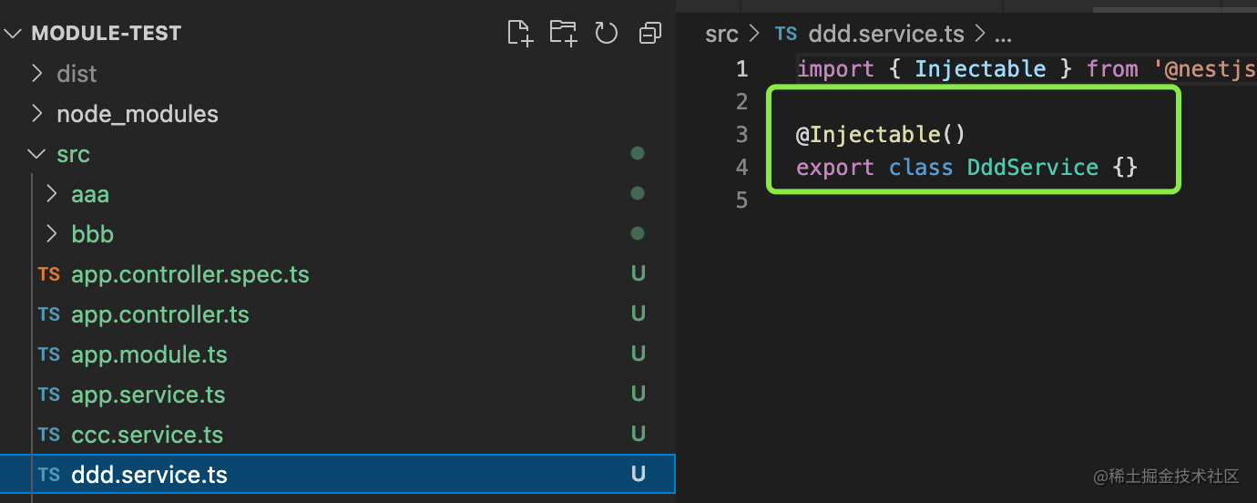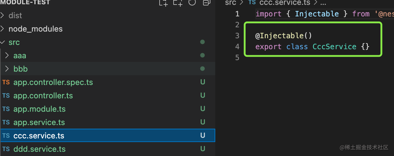 nest g service ddd --no-spec --flat分别创建 ccc 和 ddd 两个 service,–no-spec 是不生成测试文件,–flat 是平铺。