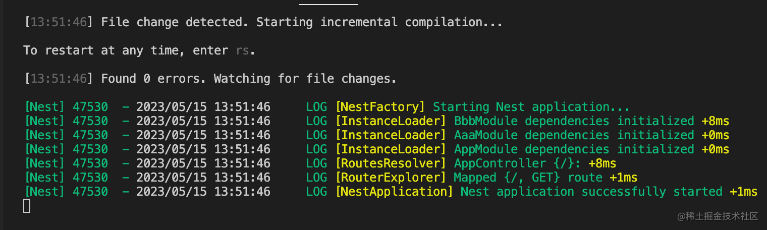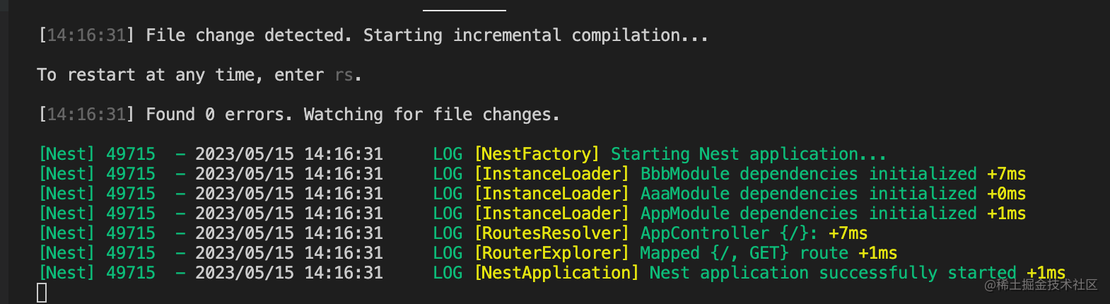 因为我们用了 nest start –watch 的方式启动的,nest 会自动重启,这时候就没有错误了: