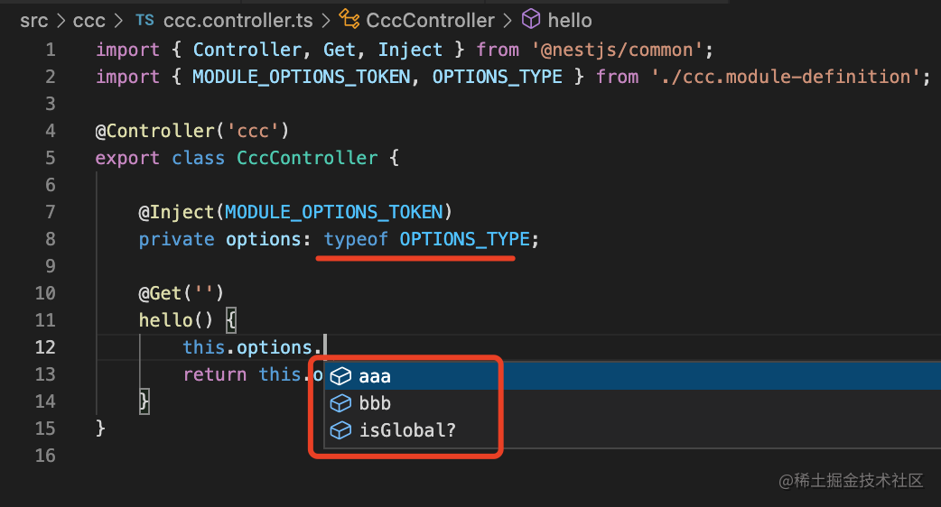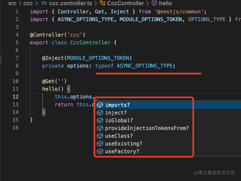 而且这时候我们把传入的 options 通过 useValue 创建了个 provider,这样模块内部就可以注入它了。