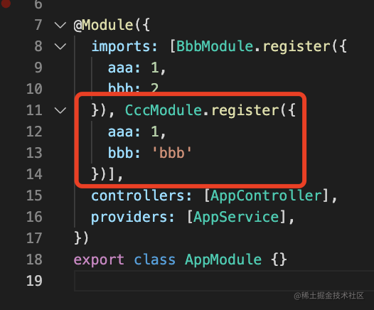 register:用一次模块传一次配置,比如这次调用是 BbbModule.register({aaa:1}),下一次就是 BbbModule.register({aaa:2}) 了