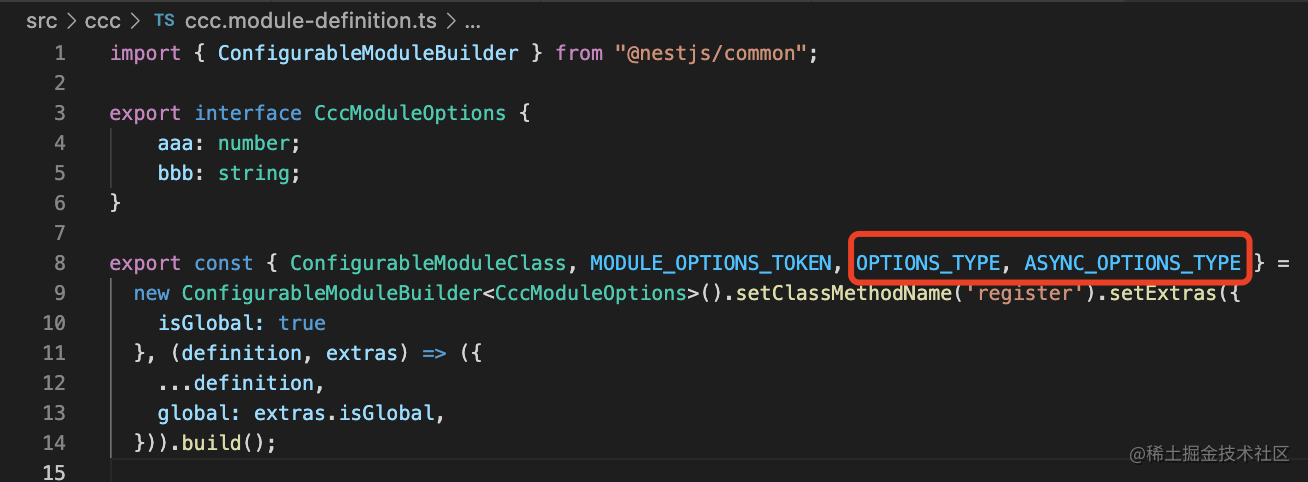 new ConfigurableModuleBuilder<CccModuleOptions>().build();用 ConfigurableModuleBuilder 生成一个 class,这个 class 里就带了 register、registerAsync 方法。