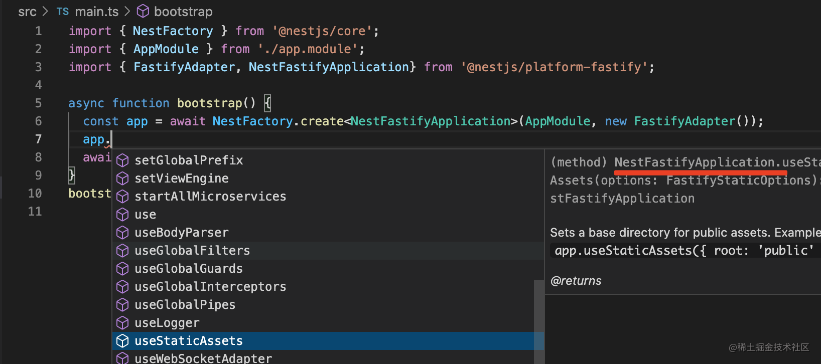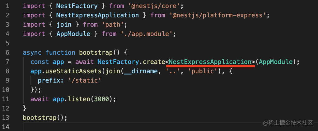 这也是为什么之前我们要传入 NestExpressApplication 才有 useStaticAssets 方法: