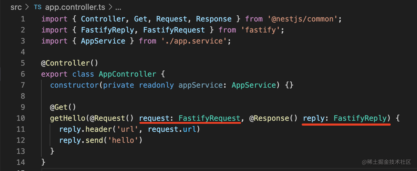 getHello(@Request() request: FastifyRequest, @Response() reply: FastifyReply) {