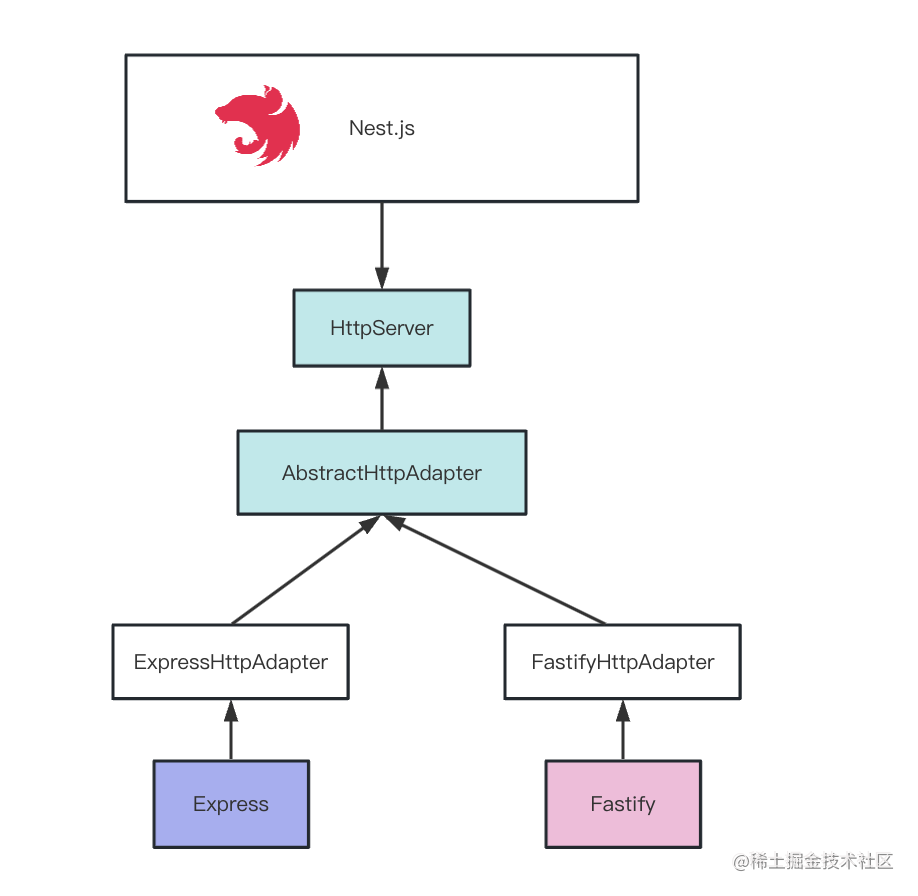 这种加一层抽象和适配器的方式,能让 Nest 更加通用、灵活,有更强的扩展性。