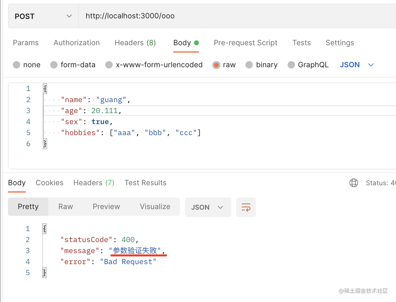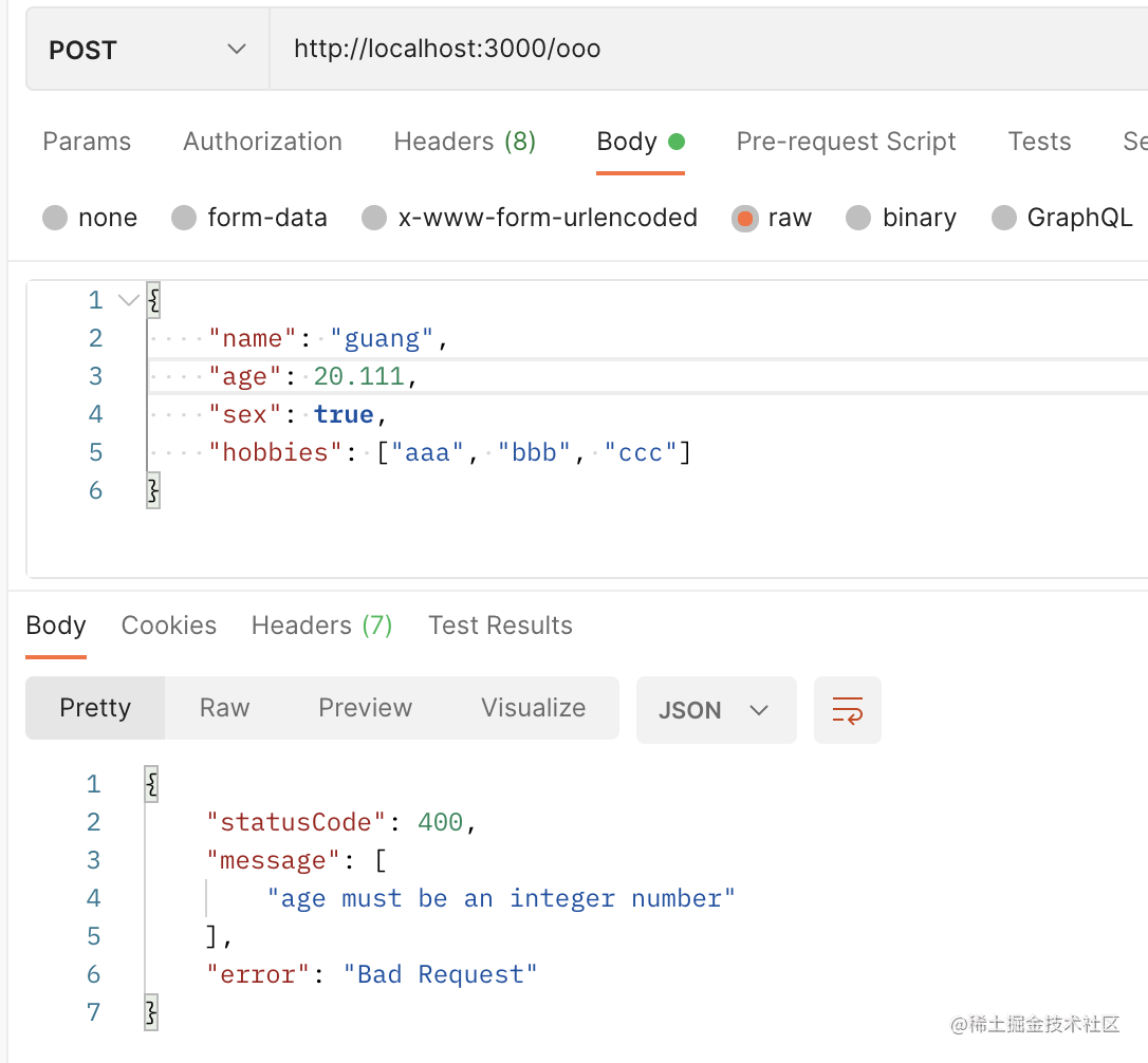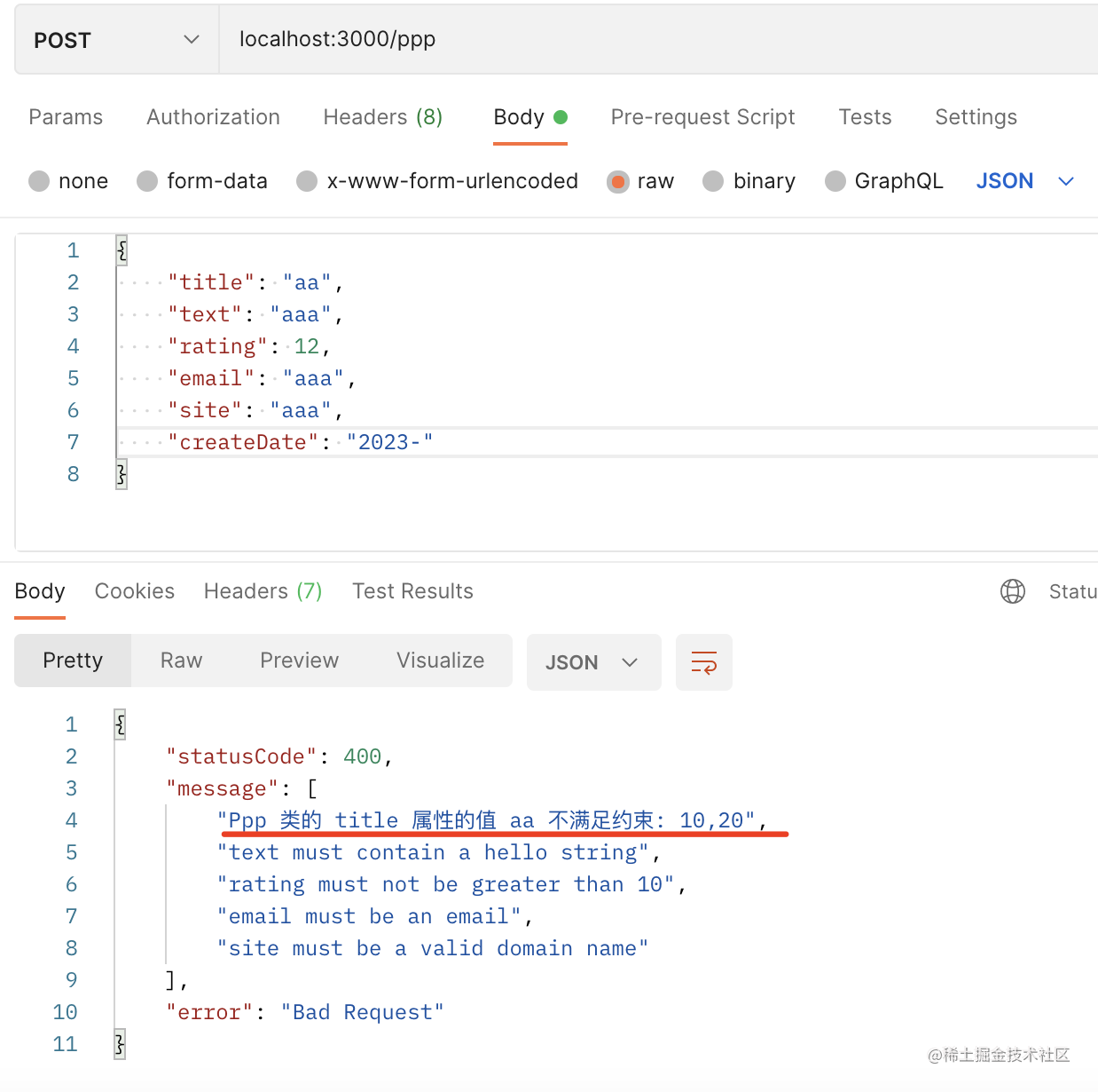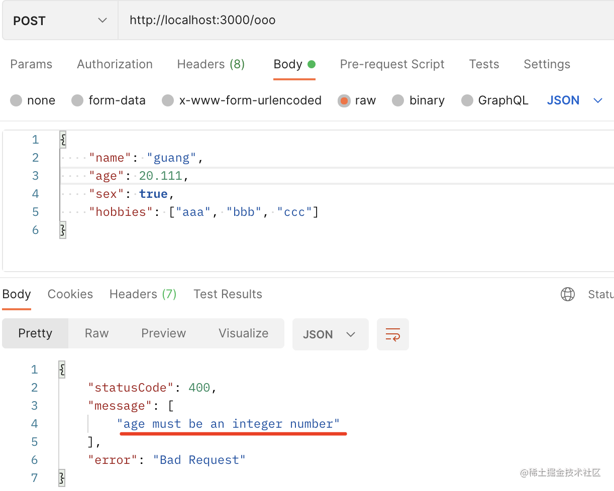 当参数不正确,ValidationPipe 就会返回 class-validator 的报错: