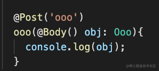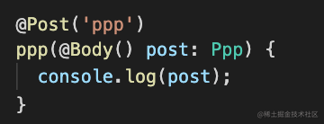 post 请求的数据是通过 @Body 装饰器来取,并且要有一个 dto class 来接收: