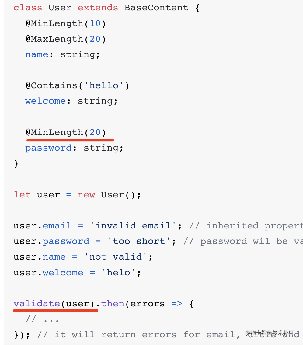 class-validator 包提供了基于装饰器声明的规则对对象做校验的功能: