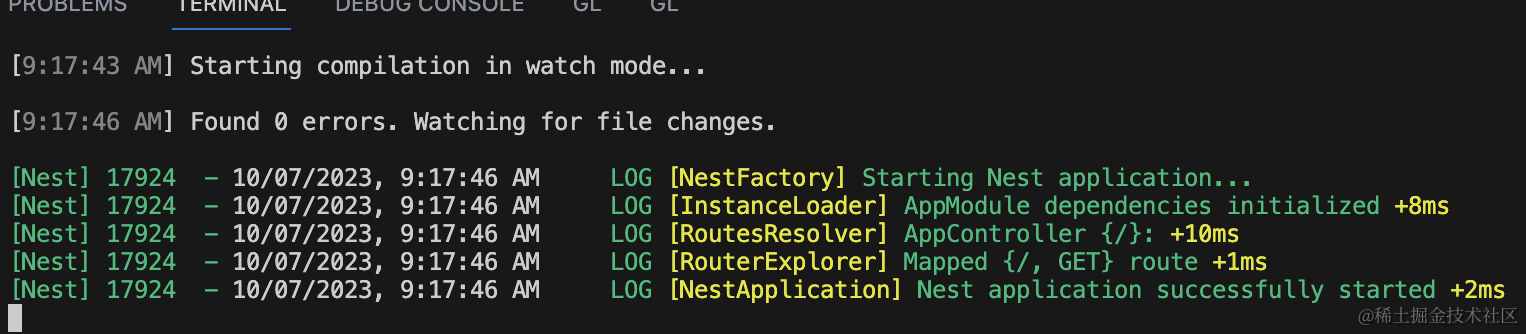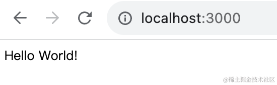 npm run start:dev浏览器访问 http://localhost:3000 可以看到 hello world,代表服务跑起来了: