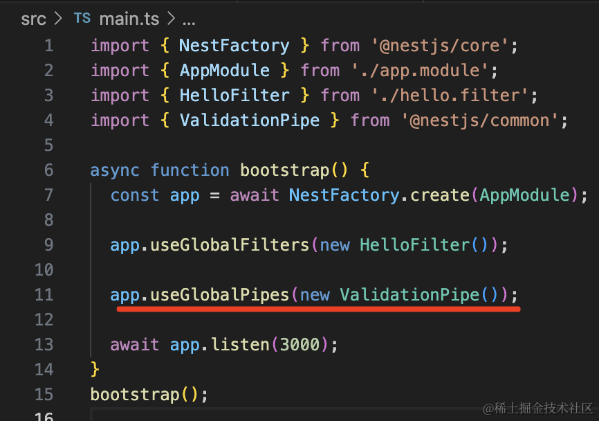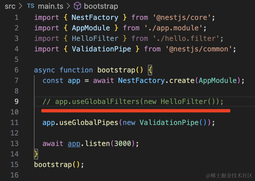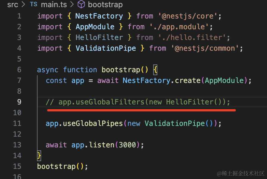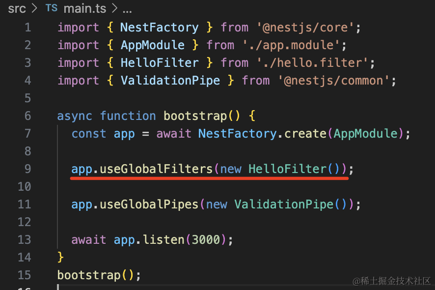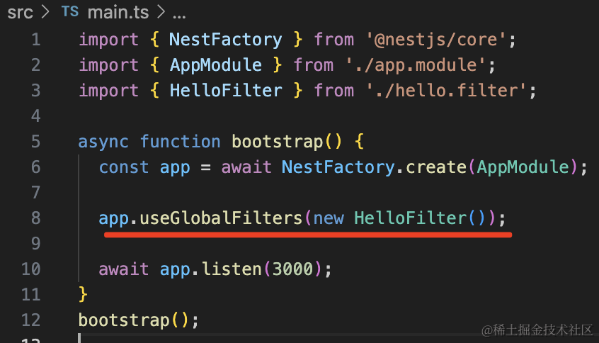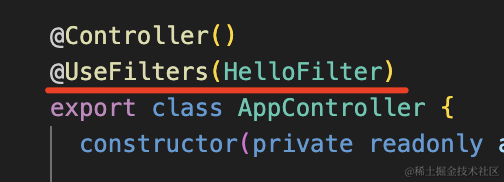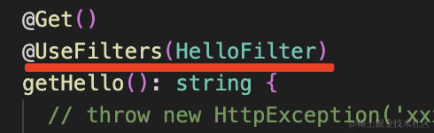 app.useGlobalFilters(new HelloFilter());如果你想局部启用,可以加在 handler 或者 controller 上: