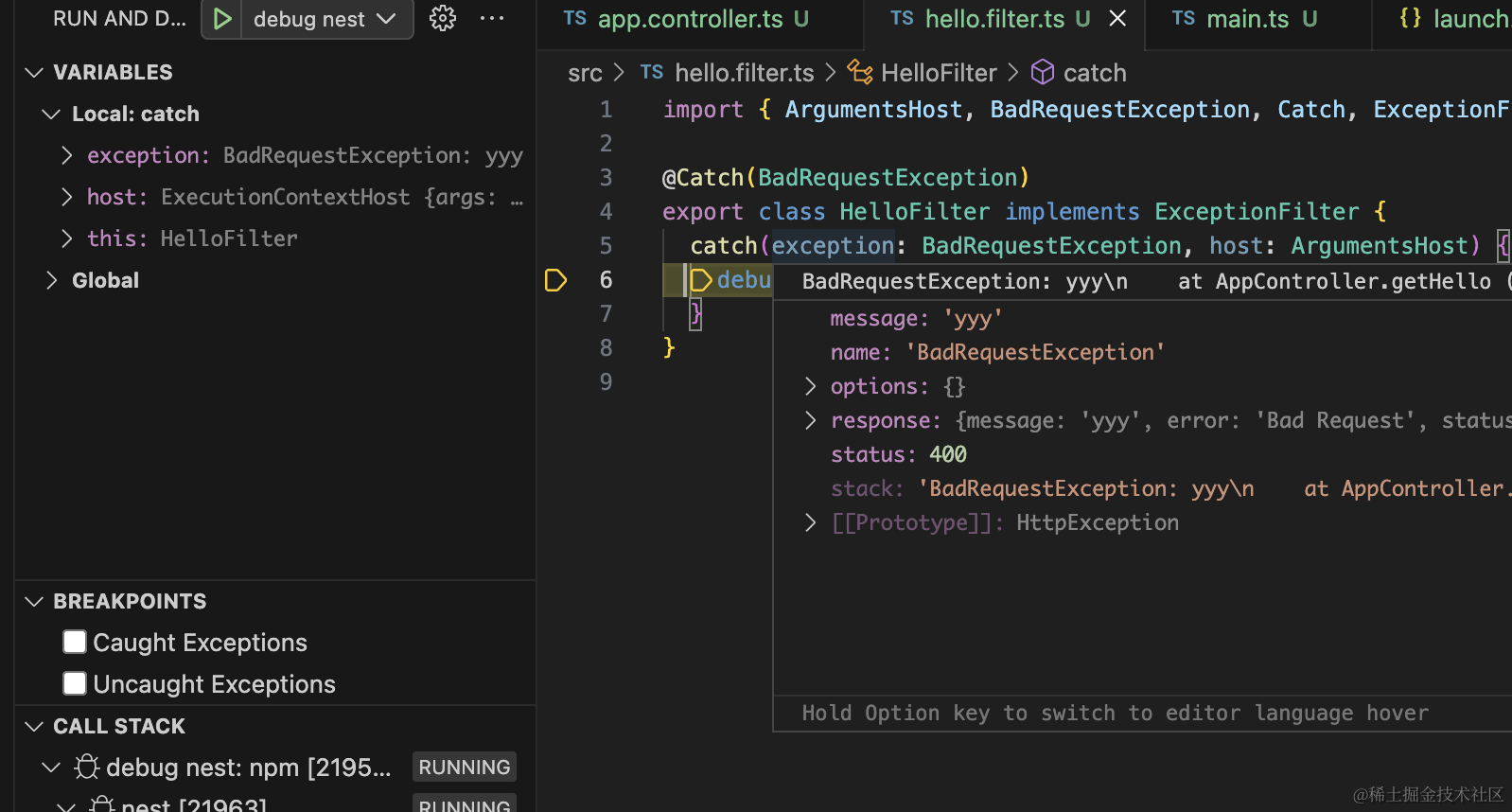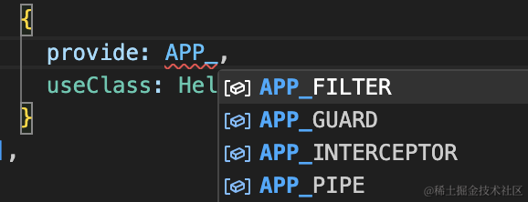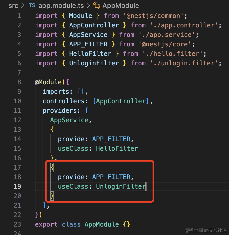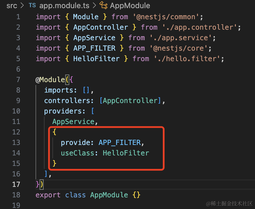 }Nest 会把所有 token 为 APP_FILTER 的 provider 注册为全局 Exception Filter。