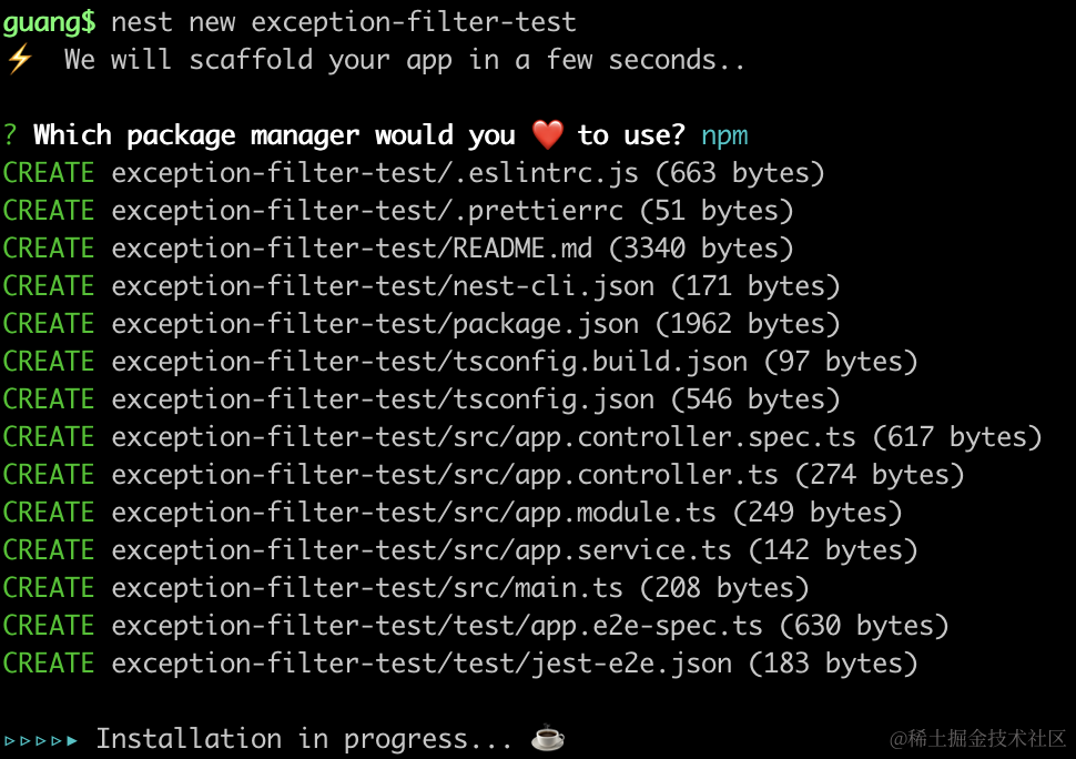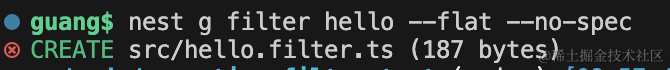 nest g filter hello --flat --no-spec–flat 是不生成 hello 目录,–no-spec 是不生成测试文件。