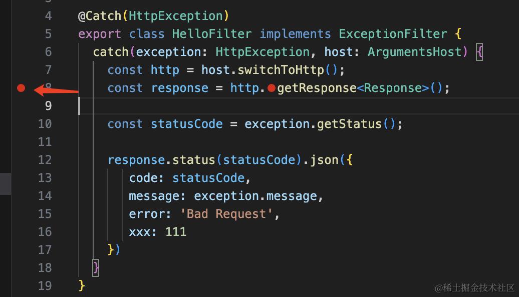 Exception Filter 是在 Nest 应用抛异常的时候,捕获它并返回一个对应的响应。