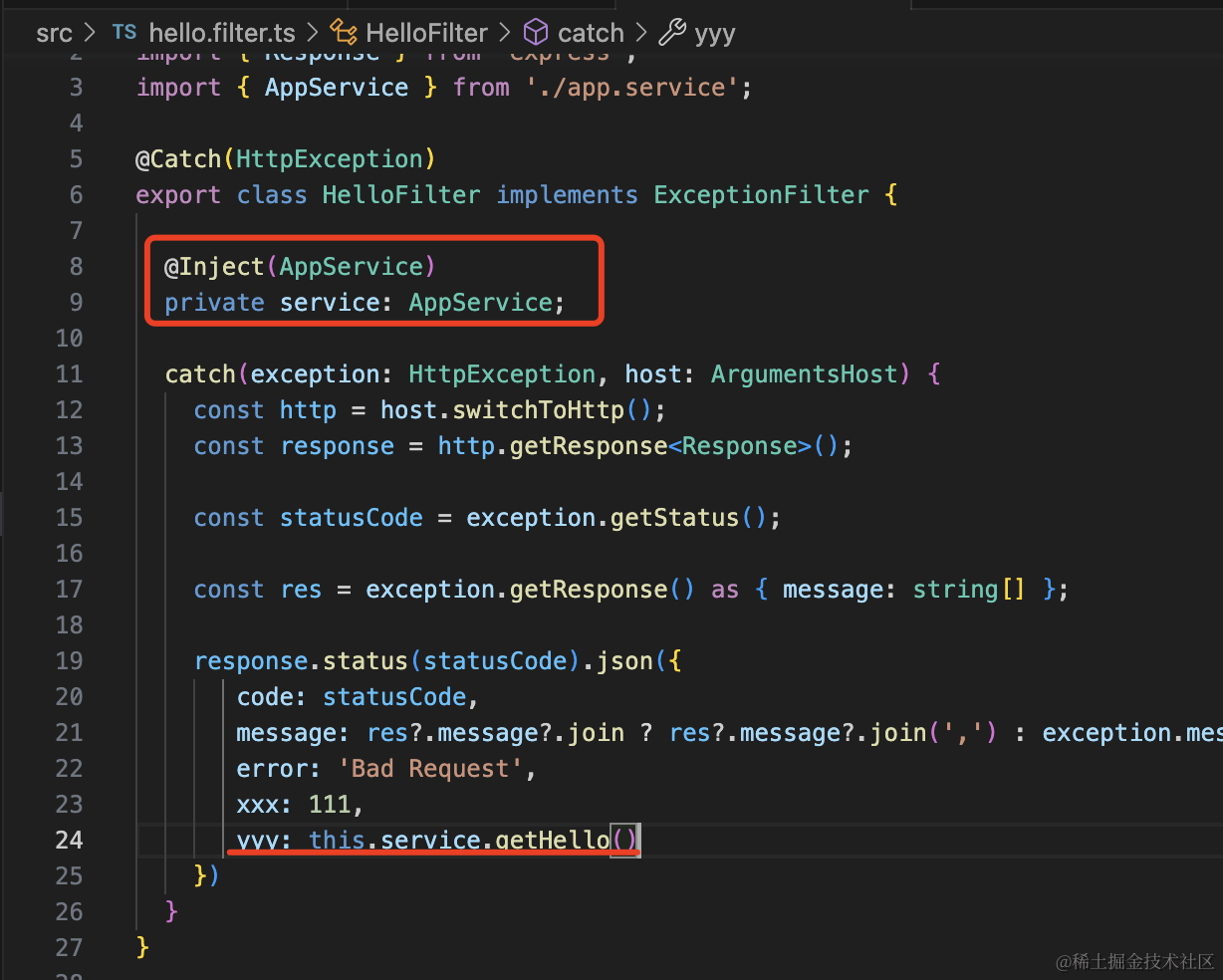 如果 filter 要注入其他 provider,就要通过 AppModule 里注册一个 token 为 APP_FILTER 的 provider 的方式。