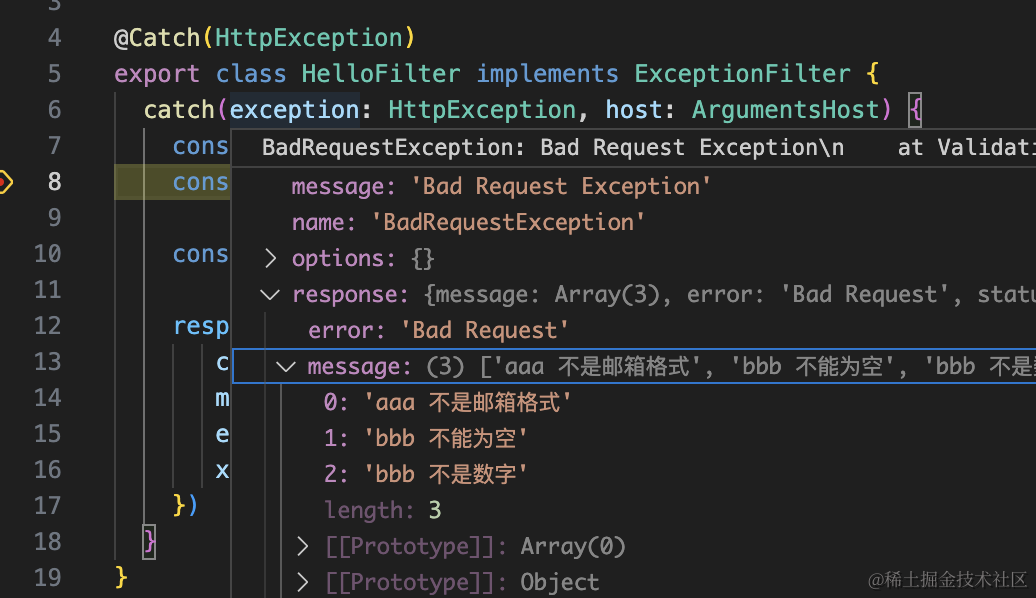 如果捕获的是 HttpException,要注意兼容下 ValidationPipe 的错误格式的处理。